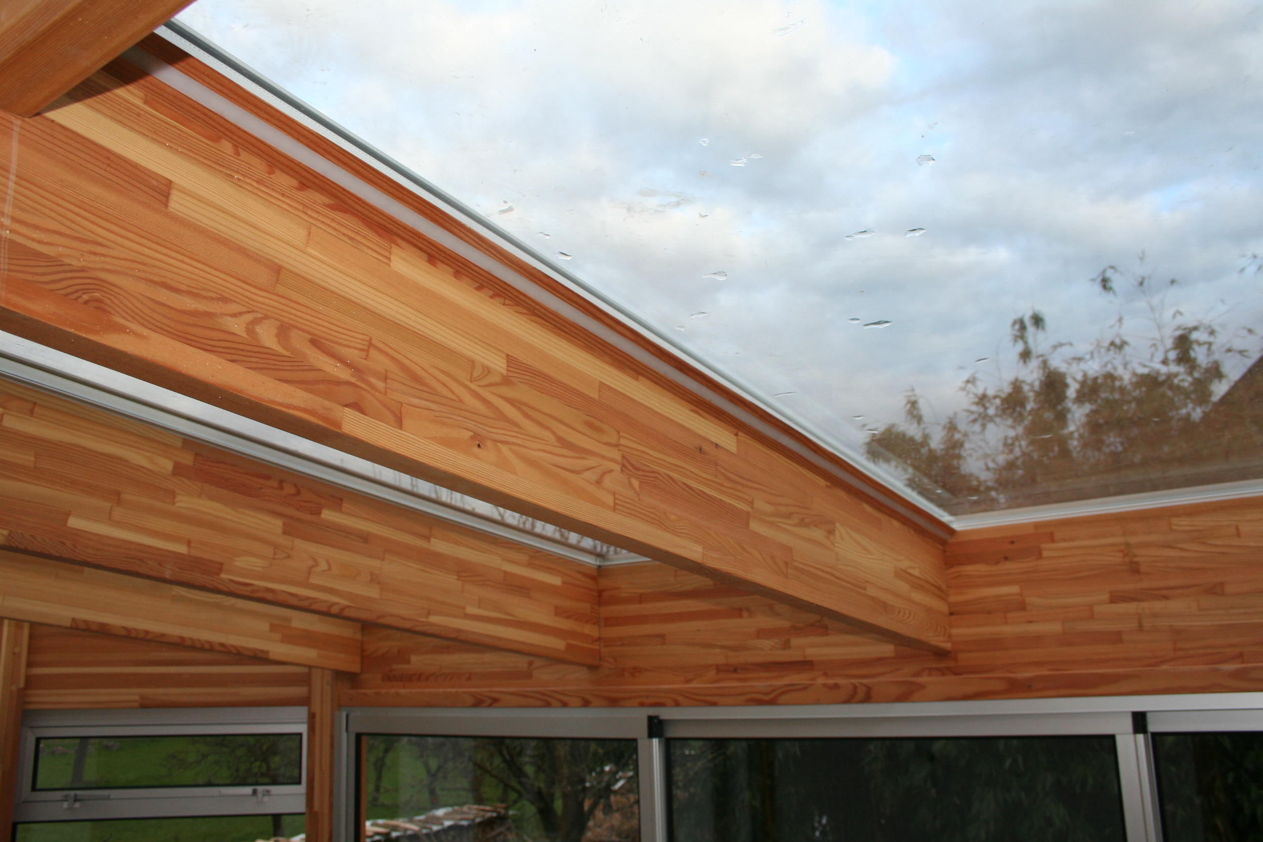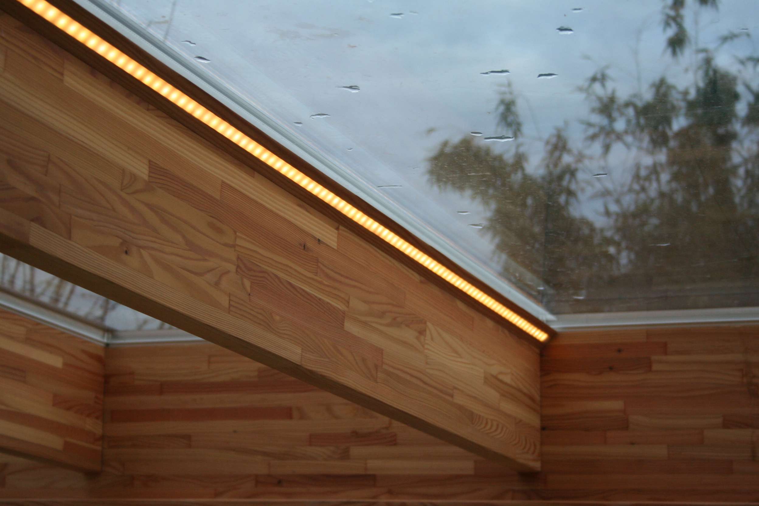 intergrierte LED-Beleuchtung in einem Wintergarten durch angepasstes Holzprofil – ausgeschaltet